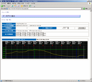 表形式で閲覧を行う場合には または をクリックします。 をクリックすると【画面2-4-6.グラフ閲覧】が、 をクリックすると【画面2-4-6-1.複数信号グラフ閲覧】が表示されます。【画面2-4-6.グラフ閲覧】では1つの信号毎のグラフを、 【画面2-4-6-1.複数信号グラフ閲覧】では複数(MAX 8信号)の信号を1つのグラフに描画します。 1信号の詳細を見るには【画面2-4-6.グラフ閲覧】を、複数信号の相関を見るには【画面2-4-6-1.複数信号グラフ閲覧】をご利用ください。 グラフは対象となる信号を選択し、その信号のY軸(データ値)の表示倍率、グラフを作成する期間を 選択し、【グラフ作成】ボタンをクリックして作成します。 信号は最大で3つまで選択でき、別々のグラフとして作成されます。 グラフは横軸が時間軸、縦軸がデータ値で、黄色の折れ線でデータの時間推移がグラフ表示されます。 緑色の十字線はグラフ表示範囲での最大データ部分、青色の十字線最小データ部分になります。 赤色で表示される数字はデータの プロット点数を表します。 表示されたグラフから再度条件を変えて作成する場合には条件を変更し、 再度【グラフ作成】ボタンをクリックします。 グラフはSVG形式の画像として作成されます。 Webブラウザの キャッシュの設定によっては正常に表示が行われない場合があります。 再作成時に画像が正常に表示されないような場合にはWebブラウザの キャッシュの設定を見直して下さい。 また、保存件数が多い(1000件以上)ファイルでグラフを表示しようとすると 処理に長い時間がかかります。 グラフ表示するファイルは1000件以下になるように保存設定を行ってください。 |